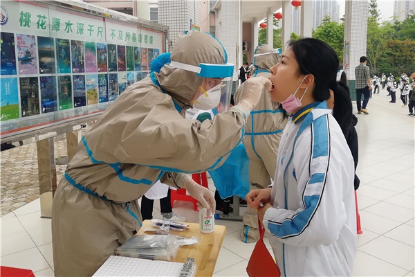 火炬區一中將自主文化廣場定為檢測場地,確保通風良好。受測學生從學校南門進入廣場,所有學生、工作人員進校前需做體溫篩查和查驗粵康碼,無粵康碼、非綠碼人員及體溫異常不可入校。檢測時要出示身份證或學生證(學籍號),需戴口罩。學校安排全程錄像。現場共分15列縱隊檢測,至下午4時左右,市疾控中心的工作人員完成全部檢測任務。