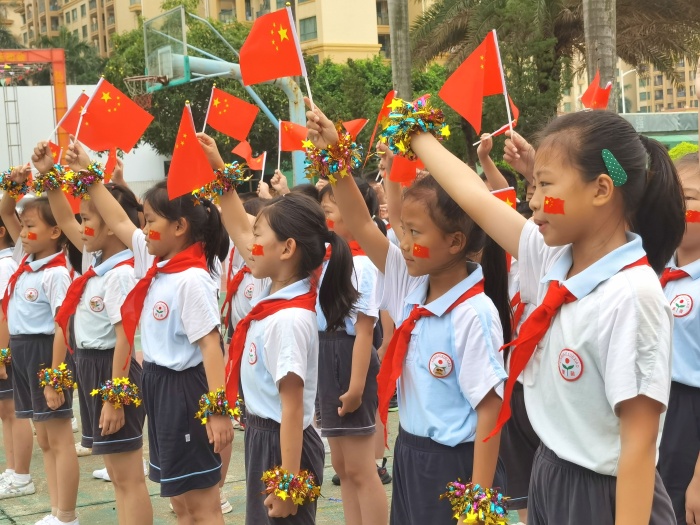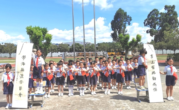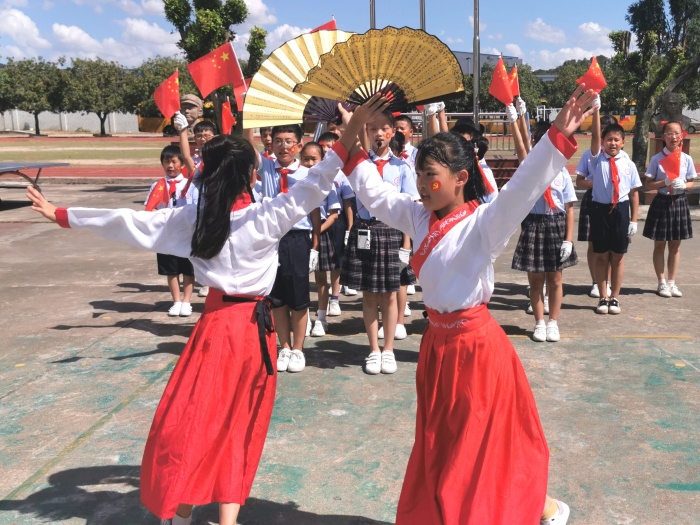 “今天是你的生日,我的中國……”“五星紅旗迎風飄揚,勝利的歌聲多么響亮……”“道可道,非常道;名可名,非常名......”伴隨著悠揚的旋律,同學們揮舞著國旗、黨旗,或歌或舞,或吟或誦,或書或畫,用不同形式抒發對祖國的美好祝福和對經典詩文的無限熱愛。“驛旅客逢梅子雨,池亭人挹藕花風。”韻律優美的《笠翁對韻》,一組對詞就是一句念白,一副對子就是一段唱腔,妙不可言,同學們在誦讀中不知不覺掌握對仗用韻,學會遣詞造句,奠定了國學根基。朗朗上口的《三字經》《千字文》《弟子規》節奏明快,更匯集古代圣賢思想,同學們在誦讀中傳承著少年養志、知書達理的中華文明。