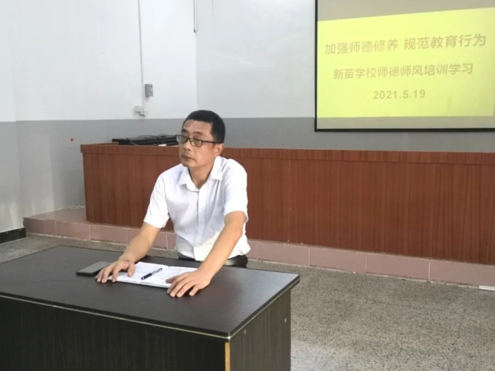 為進一步提高教師的業務水平,樹立良好的教師形象,打造一支師德高尚、教風優良的優秀團隊,5月19 日晚,新苗學校組織全體教師在修身學堂開展了以“加強師德修養 規范教育行為”為主題的師德師風培訓,此次培訓由段岳華副校長主持。