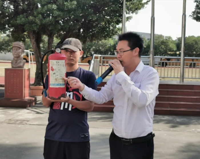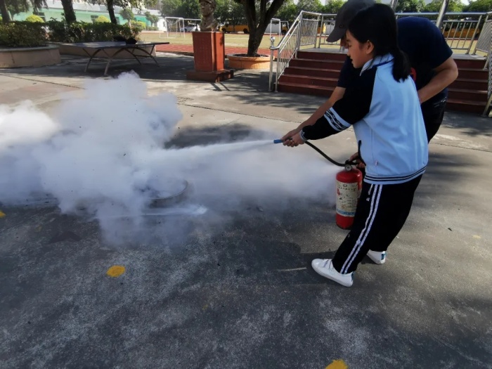 負責安全的俞希金老師非常仔細的向在場師生講解干粉滅火器的使用方法:“把滅火器罐上下晃動三次以上,將安全梢拉開,握住出粉皮管,將皮管朝向火點,距離火點2米左右用力壓下把手,對準火苗根部噴射。”大家都牢牢記住了滅火器的使用方法“一搖、二拔、三噴”。隨后老師手把手的教學生使用干粉滅火器,滅火成功后,學生們臉上洋溢著成功的喜悅。
