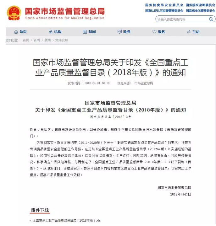 4月1日,國家市場監(jiān)督管理總局印發(fā)了關于《全國重點工業(yè)產(chǎn)品質(zhì)量監(jiān)督目錄(2018年版)》的通知: