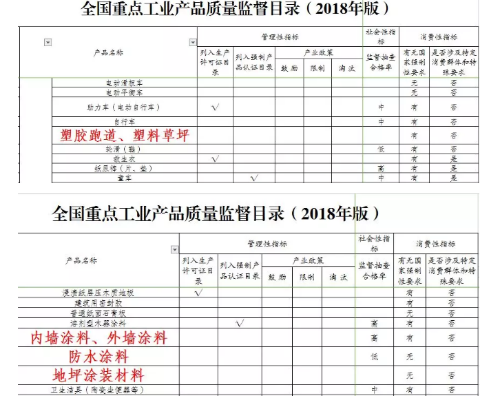 其中,塑膠跑道、人造草坪、內(nèi)墻涂料、外墻涂料、防水涂料、地坪涂裝材料等被列入《監(jiān)督目錄》,有國家強制性要求(消費性指標)。