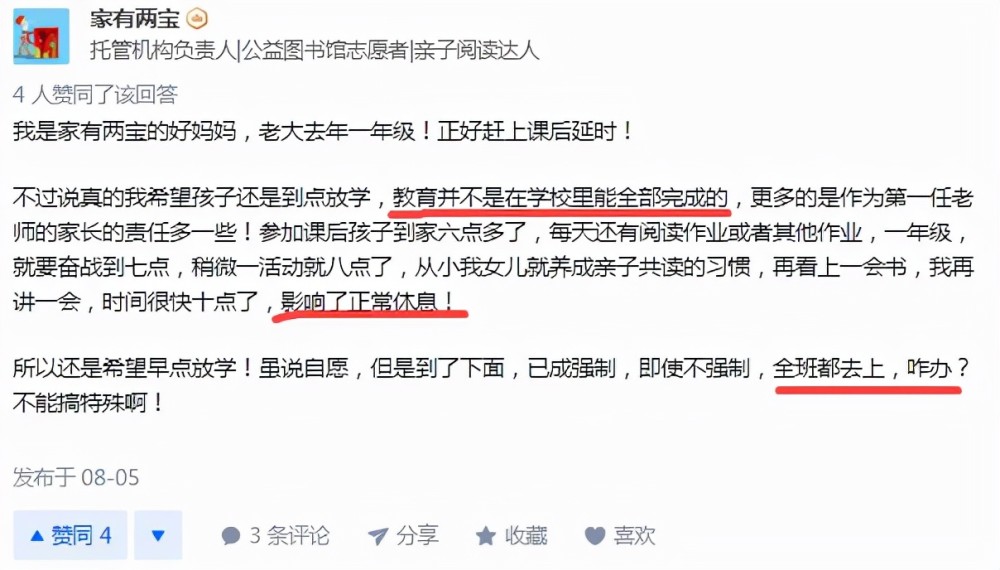 沒想到臨近開學,各中小學相繼發布課后延時服務細則。由于政策規定,學校延時服務時間最少不得早于正常放學時間2小時以內,并且最終放學時間,不得早于學生家長正常下班時間半小時以內。