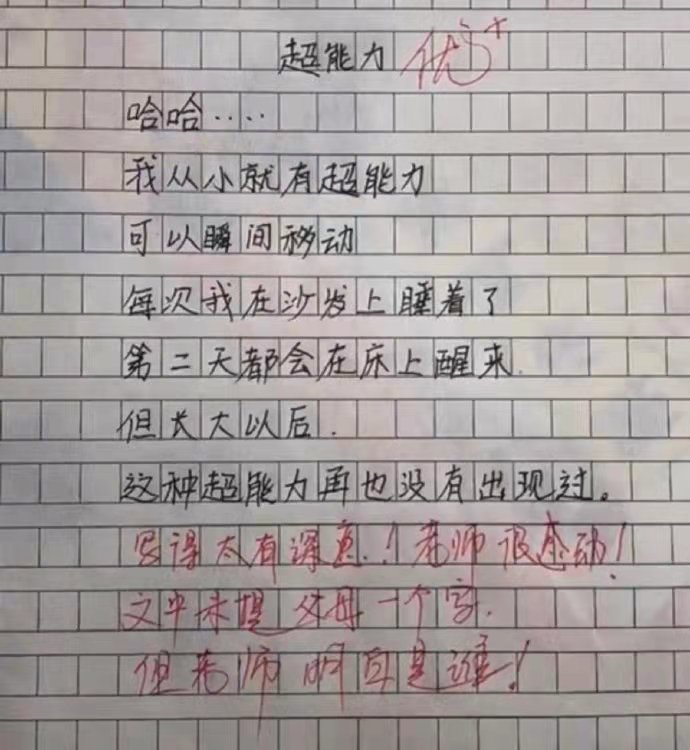 這篇文作文很短,題目是《超能力》,但是內容卻在講述和家長對學生們滿滿的愛意。學生寫到我從小就有超能力,可以瞬間移動,每一次在沙發上睡覺,第二天都會在床上醒過來。