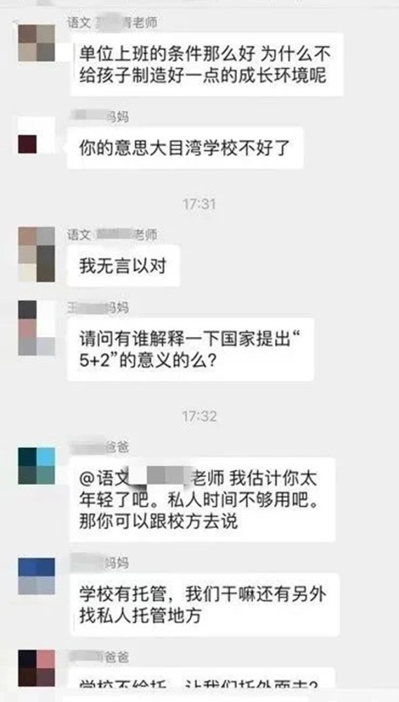 可是家長卻不那么認為,學校有延時服務,為什么還要去找私人的托管呢?并且有位家長直接懟了老師,你是不是太年輕,私人時間不夠用!一位媽媽還提出誰能給解釋下“5+2”的意義在哪里?