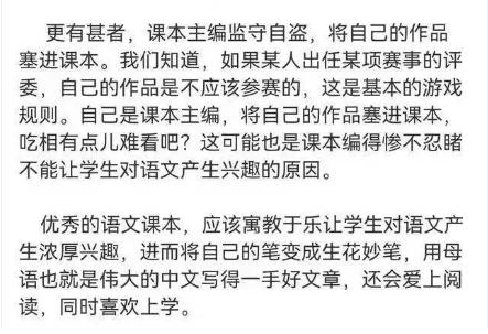 "衡量教育是否成功,我認為只有一個標準,就是受教育者對所學課程的興趣是越來越大還是越來越小?如果學生對所學的課程興趣越來越大,這個教育就成功了,反之則相反。而我拜讀的這些語文課本不但不能讓學生對語文發生興趣,反而可能會讓學生厭倦,甚至恐懼語文。”