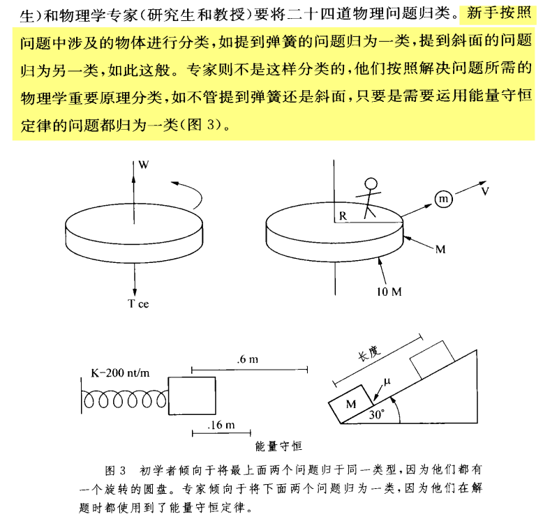 生活其實沒有捷徑,專家也是經(jīng)歷了博聞強記之后才練就成了專家。專家能一下子看出來事情或者問題的深層結構,比如書里提到的物理題目的例子,新手會按照物體屬性進行分類為彈簧和斜坡,而專家則會根據(jù)物理原理的解題思路將彈簧和斜坡全部歸為能量守恒定律問題類。