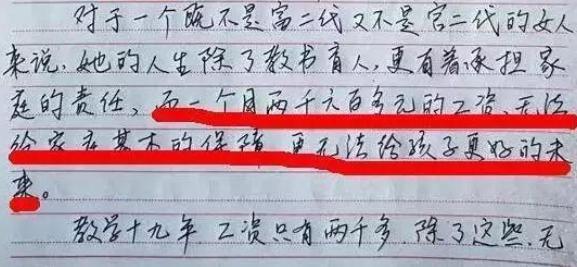 看到這里,可能會有人產(chǎn)生質(zhì)疑,不是一直說給老師漲工資嗎,甚至在很多人看來,老師是個高收入群體,其實這僅是個別現(xiàn)象,在發(fā)達城市,老師的收入會與當(dāng)?shù)亟?jīng)濟水平持平,因此工資相對較高,在三四線城市,很多老師依然每月拿著兩三千的工作,尤其是鄉(xiāng)村教師,不僅工資低,教學(xué)環(huán)境惡劣,老師的工資也只能維持溫飽。