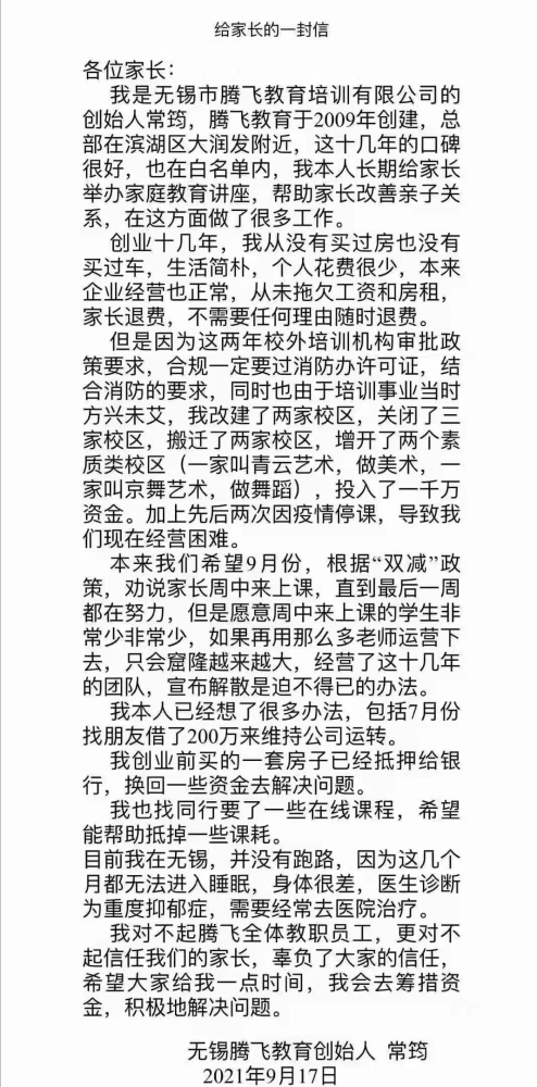 看了常老師的這封信,感覺確實不易,與其他機構負責人卷錢跑路相比,常老師還是值得敬佩的,不知道他會用什么辦法來解決好問題,只是苦了家長和學生,無法到上課無法退款,可能現在最好的辦法就是等了吧。