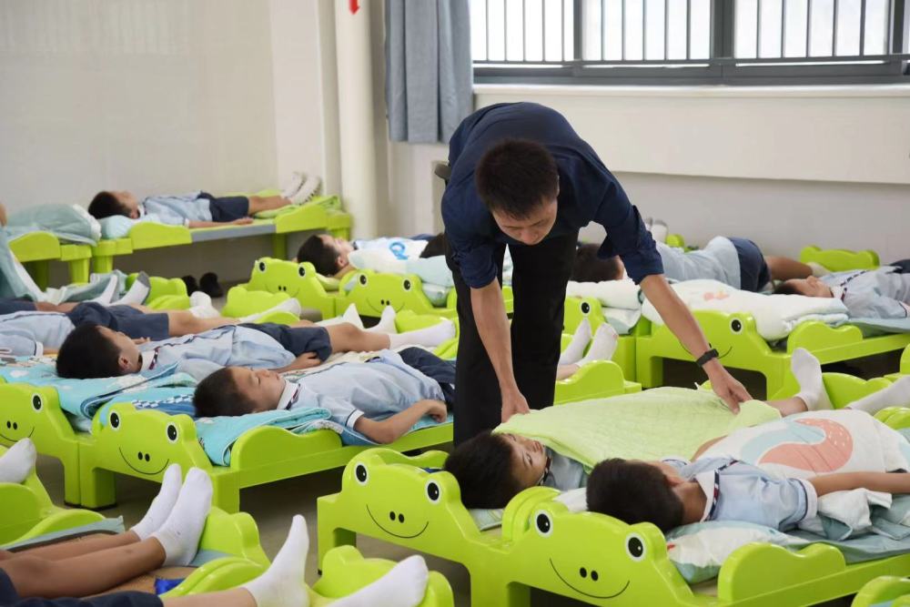 廣州市南沙區灣區實驗學校(廣州實驗教育集團灣區實驗學校)一直堅持提供“有溫度的課后托管服務”。目前,灣區實驗學校小學部共有14個班,學生509人全部實現午休躺著睡――學校為每個孩子統一配備了午休床,每張午休床長1.5米,寬0.6米,適合絕大多數小學生使用。為讓學生有更舒適的休息環境,每間午休室里還安裝風扇、空調,每天由專業人員進行清潔、消毒。為保障學生的午休紀律,提高午休質量,各班午休室由科任老師親自監督管理,午休過程井井有條,高效快捷。