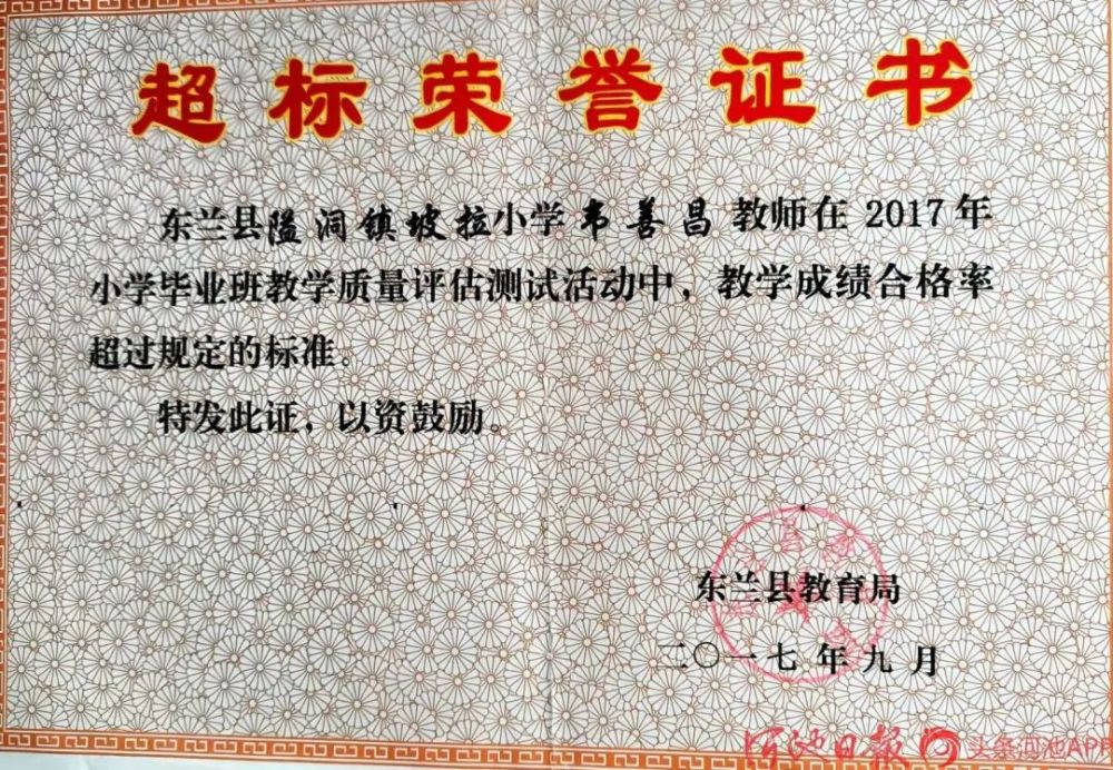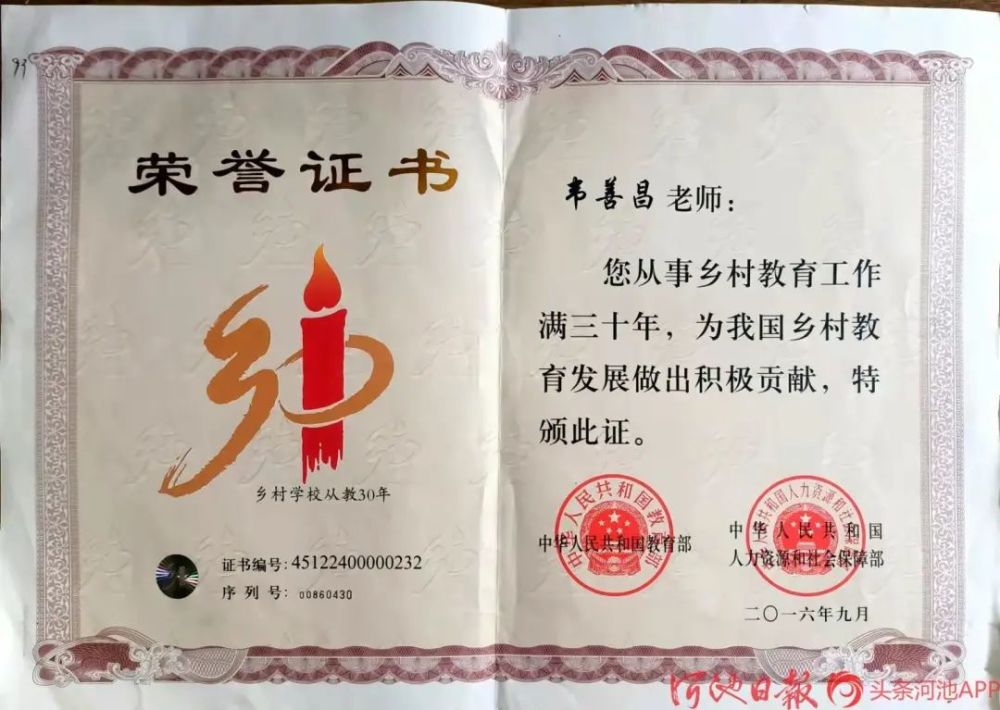 37年來,韋善昌在鄉村教師的崗位上嚴格要求自己,并獲得多項縣級、市級、國家級榮譽。2016年9月,他榮獲教育部、人力資源和社會保障部聯合頒發的“鄉村學校從教30年教師榮譽證書”。