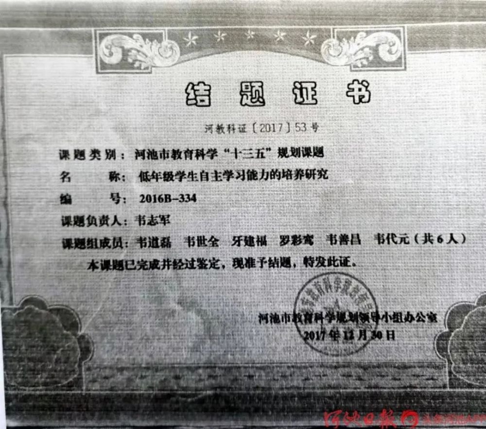 多年來,韋善昌參與多項科研獲得順利結題,并被推廣使用。2017年至2021年6月,他完成市“十二五”教育科學規劃重點課題中小學生學習方法研究與實踐之子課題《低年級學生自主學習能力的培養研究》《小學中高年級學生數學計算能力的培養》等4個,完成效果良好,并被推廣使用。2021年6月,發表論文《試探小學語文教學與德育的融合路徑》榮獲國家級優秀論文一等獎。