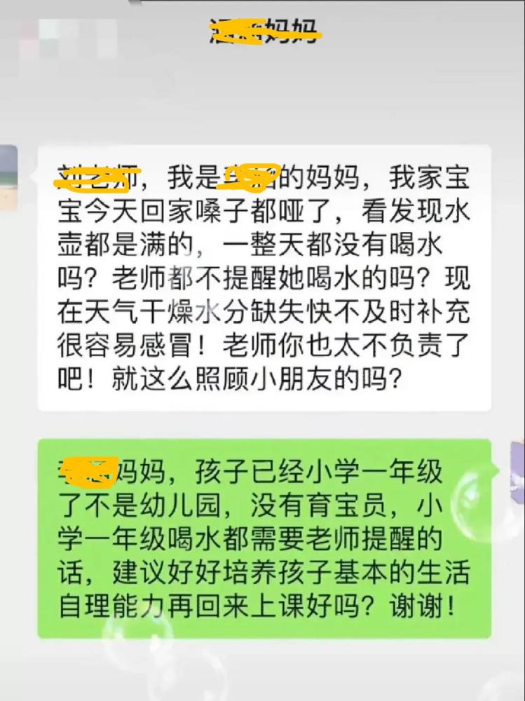 看到對方語氣這么沖,自己也不服輸,回懟:一年級不是幼兒園,沒有育寶員,如果連喝水都需要老師提醒的話,建議好好培養孩子基本的生活自理能力再回來上課。