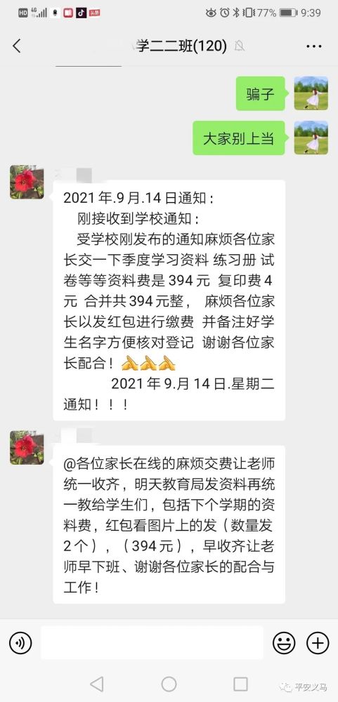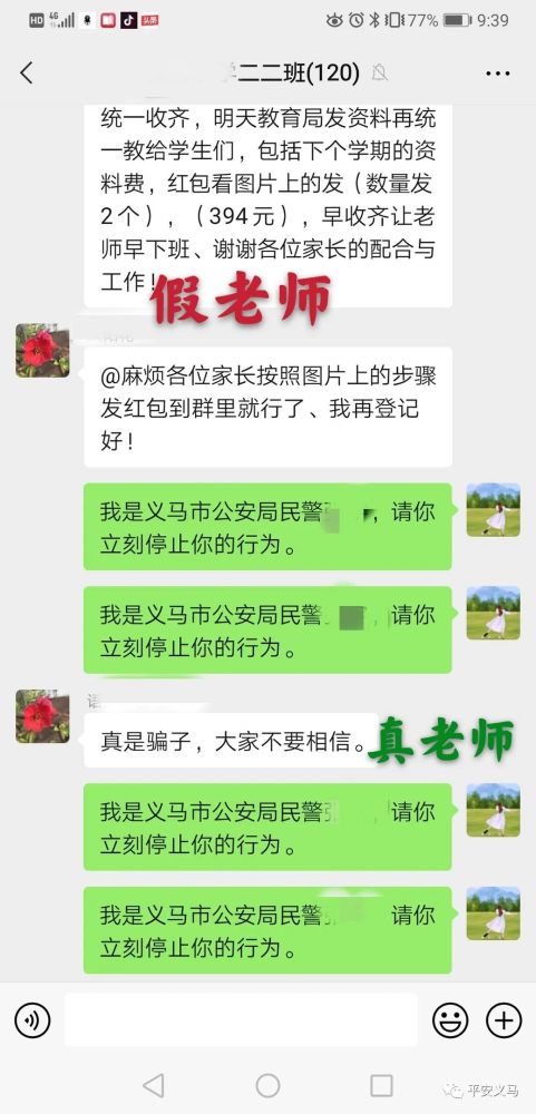 9月14日晚9點(diǎn)39分,在我市某小學(xué)家長(zhǎng)微信群里,突然出現(xiàn)了第二個(gè)班主任,這位“班主任”發(fā)布了一份以假亂真的學(xué)校通知,要求每位家長(zhǎng)以發(fā)紅包備注名字的方式上交學(xué)習(xí)資料費(fèi)共計(jì)394元。只是這位“假班主任”萬萬沒想到,群里的學(xué)生家長(zhǎng)中“藏”著真警察。不到一分鐘的時(shí)間,騙術(shù)被揭穿,家長(zhǎng)群里上演了一幕“教科書式”反詐行動(dòng)。