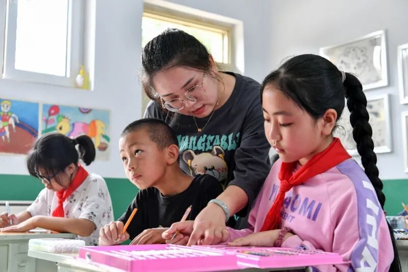 9月3日,在山西省陽泉市平定縣巨城鎮(zhèn)鳳凰垴小學(xué),老師在指導(dǎo)學(xué)生畫畫。新華社發(fā)