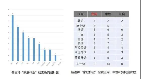 我按照圖片的情緒負向、正向、中性來做了一個計數(見圖1)。發現韓國語檢索到的負向圖片有8張。芬蘭語,沒有一張負向的圖片,也沒有一張正向圖片,只有中性圖片。所以芬蘭這個國家是不是特別值得研究?中文檢索的家庭作業圖片,出乎大家的意料,負向圖片也不多,正向圖片也有,中性圖片也有。做一個簡單的統計,可以看到,如果從社會輿論的角度來看,韓國的家庭作業問題更為突出。并且,東亞地區普遍負向評價較多。東亞國家的教育競爭、社會的競爭相對比較強,所以造成這一問題的原因很可能是社會競爭的傳遞。