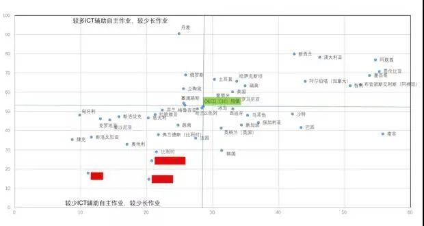 以OECD的31個國家的均值畫一個十字線(見圖7),我們可以看到,上海、臺灣和日本是較少布置用信息技術輔助進行的自主作業的,也很少布置長作業。與很多發達國家相比,這種特征更加明顯。這與整體教育的關注度有非常大的聯系。當然并不能據此詬病我們的老師故意不布置這樣的作業。