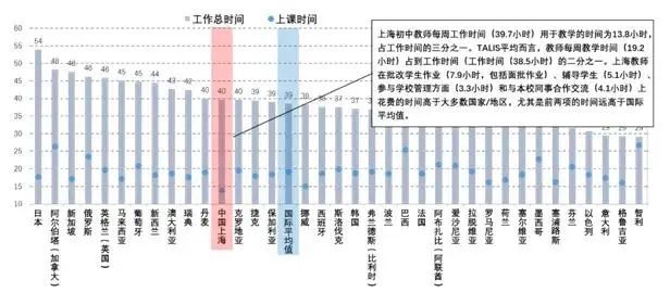 大家請看這幅圖(圖8),圖上描述的是世界上40多個國家(地區)老師每周的工作時間以及用于上課的時間。大家會發現,上海(粉紅底色)的老師工作時間處于平均水平。但上海老師的上課時間是全世界最短的,其實全國都是如此。老師的上課時間只占到其工作時間的1/3,但是全世界平均占到1/2。我們的老師把剩余的時間用來干什么呢?上海老師花費較多的時間用來進行備課、作業批改和教研活動。