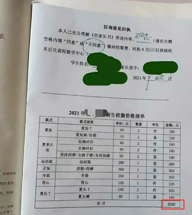 上海某?,F“天價校服”賬單,家長直接簽不同意,網友:干得漂亮