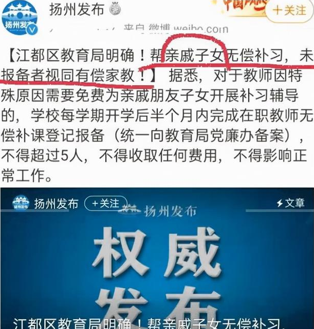 在這一問題出現(xiàn)后,揚(yáng)州地區(qū)的相關(guān)部門發(fā)布消息,表示教師為親戚子女補(bǔ)課,需提前報(bào)備,沒有進(jìn)行報(bào)備的補(bǔ)課活動(dòng)視為有償家教。如果教師的補(bǔ)課行為被認(rèn)同為有償家教的話,屬于嚴(yán)重違規(guī)現(xiàn)象,教師也可能面臨被辭退。