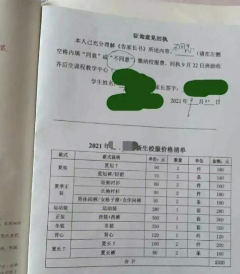 “天價校服”賬單出爐,一家長勇敢簽下“不同意”