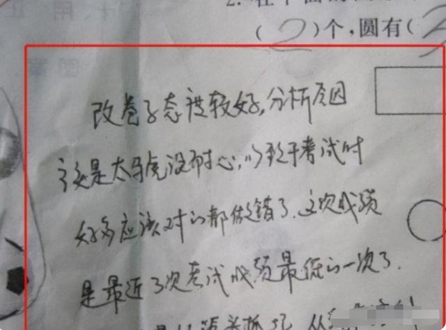 就拿這位家長來說,他在試卷上寫下了學(xué)生改卷子時的態(tài)度,還分析總結(jié)錯題原因,最后還寫了一段對學(xué)生鼓勵的話,這些都能表明他確實認(rèn)真看了孩子的試卷。