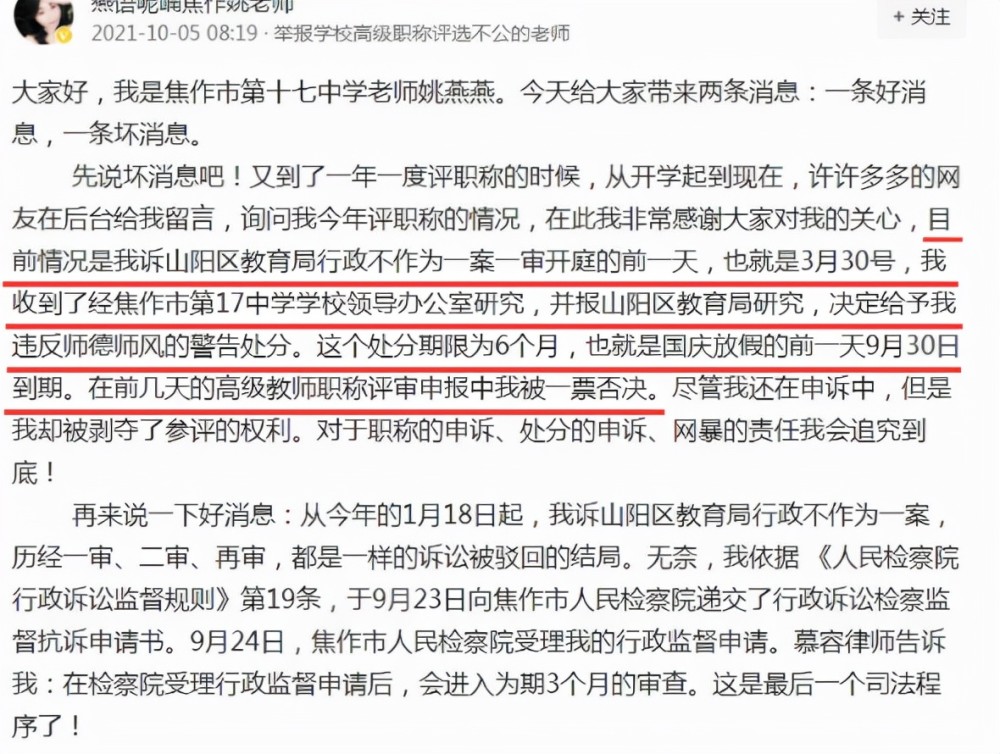 在姚老師最新的回應中,他表示將向市人民檢察院提交行政訴訟申請書,申請行政監督,而且檢察院已經接受了她的申請,在未來為期三個月的審查中,姚老師將全力配合。筆者覺得,不管最后結果如何,都會對自己造成不利影響。