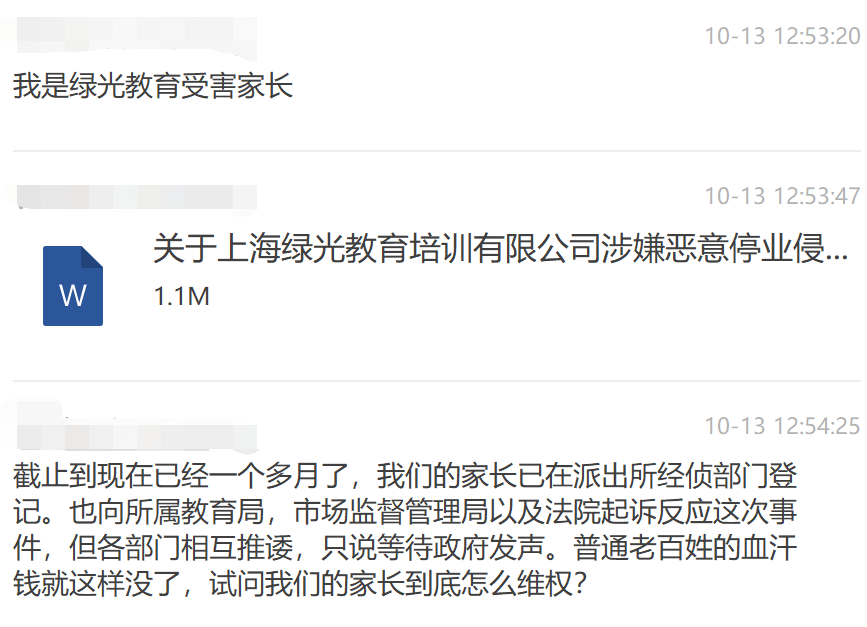 事發至今已一周有余,綠光教育學員家長已通過各種方式向國家有關部委及本市有關部門反映情況,希望本市相關機構及普陀區職能機構,本著“為群眾辦實事”、“為百姓解難題”的宗旨盡快介入本次事件,我們相信相關機構及職能部門一定會本著公正的原則厘清線索,查清事實,還百姓一個公平公正,還社會一個清風正氣。