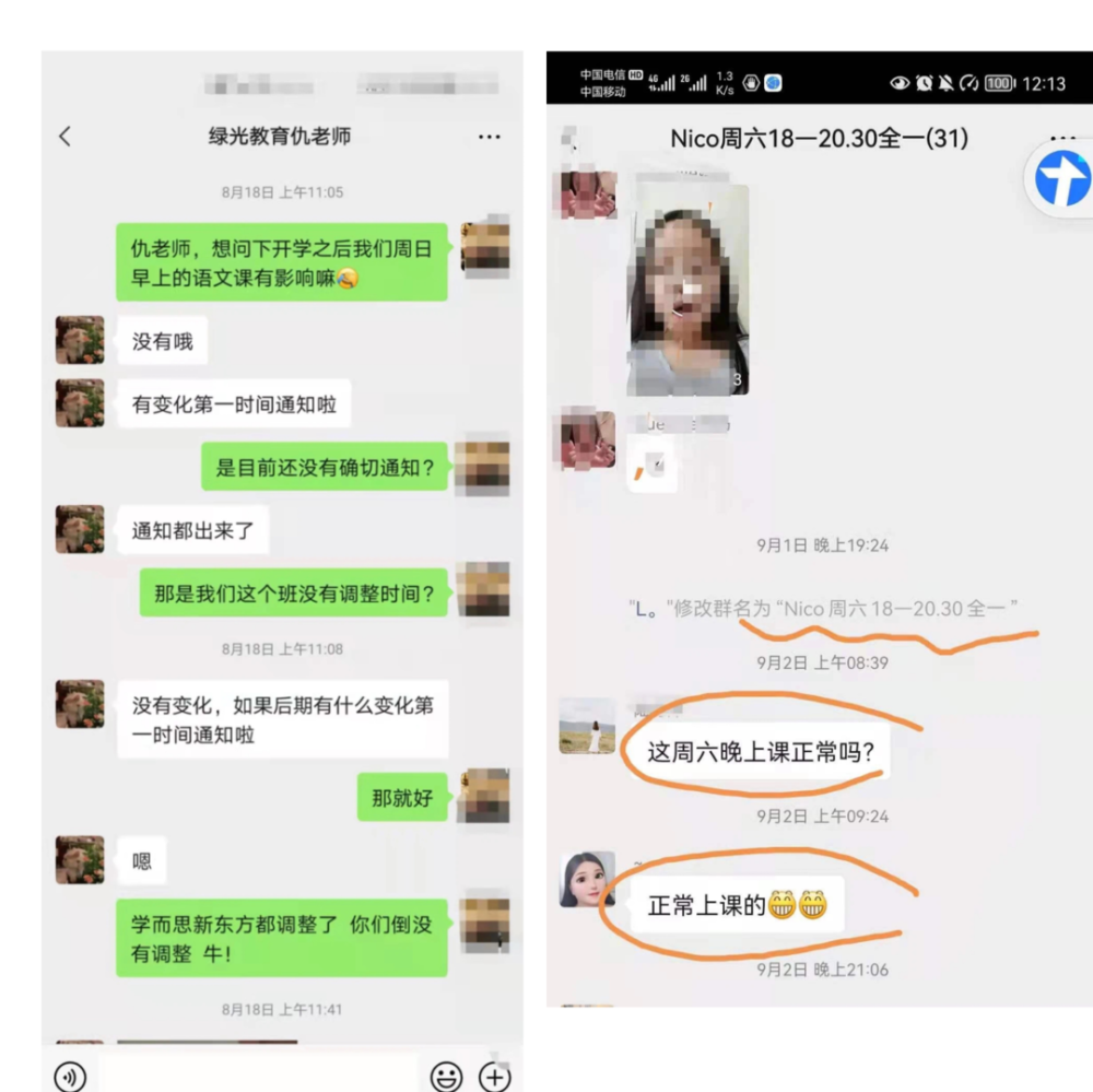 直至9月2日綠光教育停業公告的前一天,仍有工作人員利用自己是教育局白名單企業鼓動家長續報課程。我們中很大一部分家長在6-8月(雙減政策出臺后)在綠光工作人員的指導下進行了大額續費,但并未享受到對應課程服務。同時為規避國家“雙減政策”,綠光教育銷售人員表示可以實現“周中上新課,周末托管”的形式開展課程,所購買的課程服務不會受到影響;期間家長通過面談、電話、微信等方式詢問校區校長與銷售人員,相關人員對于課程服務始終表示雖然綠光教育會調整上課時間,但課程會繼續,換而言之繼續上課沒有問題。