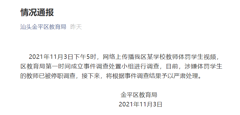 11月3日,汕頭金平區(qū)教育局官方賬號針對該視頻發(fā)布情況通報。通報中稱,區(qū)教育局第一時間成立事件調(diào)查處理小組進(jìn)行調(diào)查,目前涉嫌體罰學(xué)生的教師已被停職調(diào)查,接下來將根據(jù)事件調(diào)查結(jié)果予以嚴(yán)肅處理。