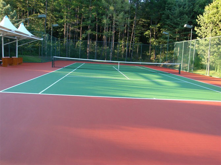 材料簡介:丙烯酸樹脂球場(彈性丙烯酸網球場,硬地丙烯酸網球場)適用于專業選手比賽和訓練使用,由100%純丙烯酸乳液加入進口色料及助劑制成,完全符合環保要求,具有較好的耐磨性能,防水、防曬、防滑、可鋪設于室內外瀝青或水泥面上??梢勒占由凹八呐浔日{整表面糙度。中級性能產品。