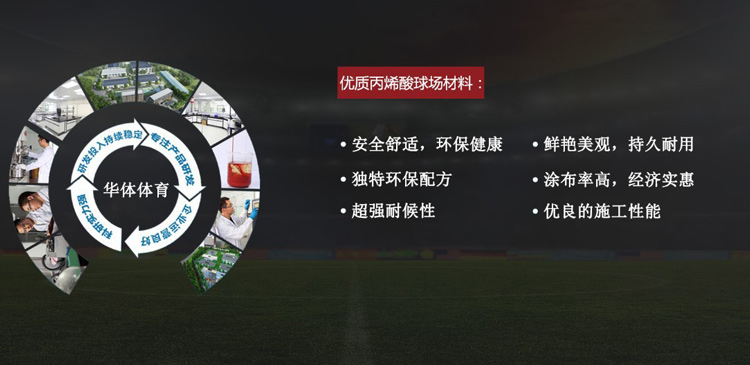 丙烯酸底中面全面升級,由華體花重金請知名高級化工教授劉信教授歷時3個月研究,于2015-3-18問世。現已全面代替傳統丙烯酸。使丙烯酸球場耐磨度提高30%,顏色細膩度提升25%,使用年限多2年。