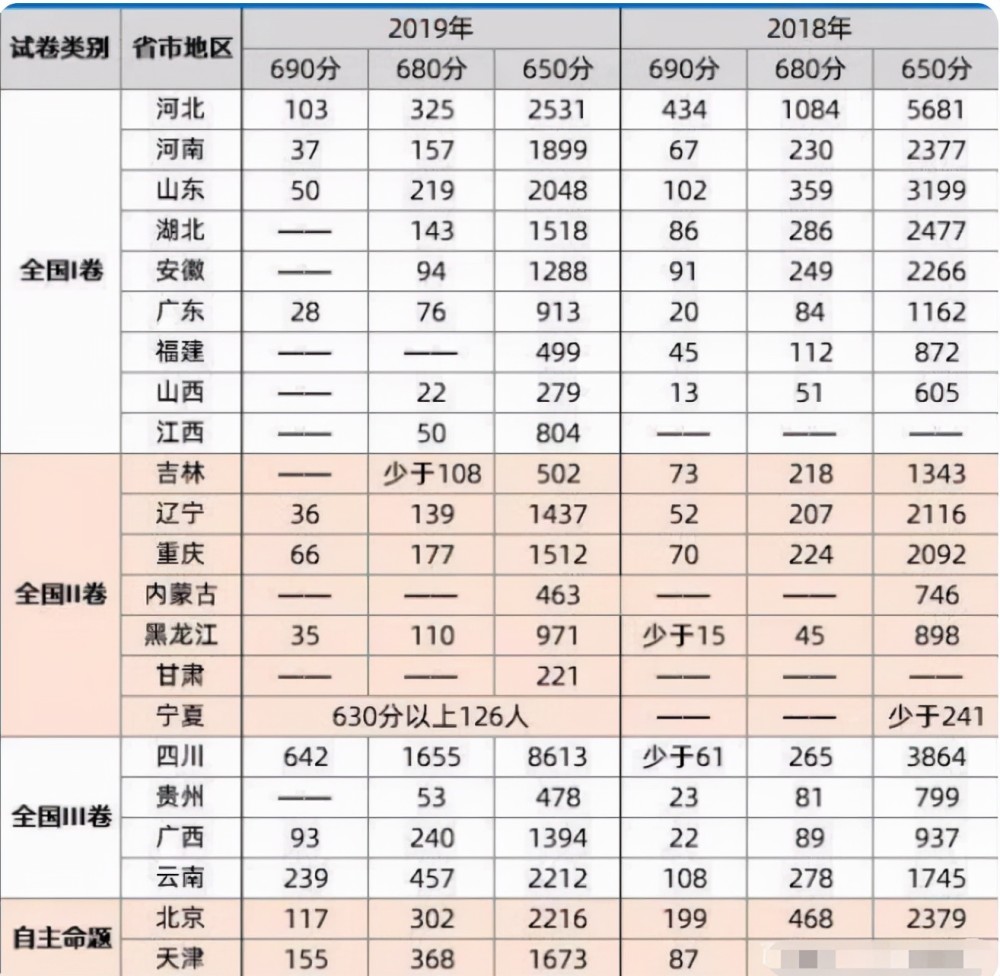 河北:大家都知道河北是我國高考大省,從高考人數中就可以看出,其人數和山東人口大省不相上下,成績也十分亮眼,尤其是其高分值的人數,更是超過了100人,中高分成績的人數的更是高達5000多人。