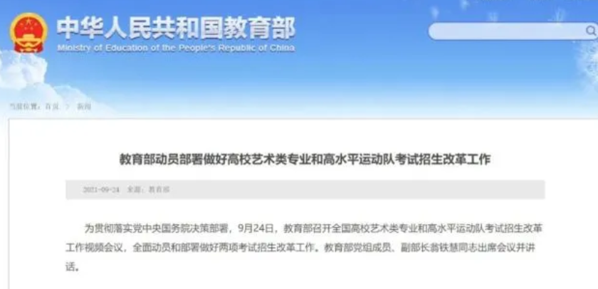 9月24日教育部召開藝術類專業和高水平運動隊招生改革工作會議,會議中針對藝術類和體育類高校專業招考進行了重新規劃。