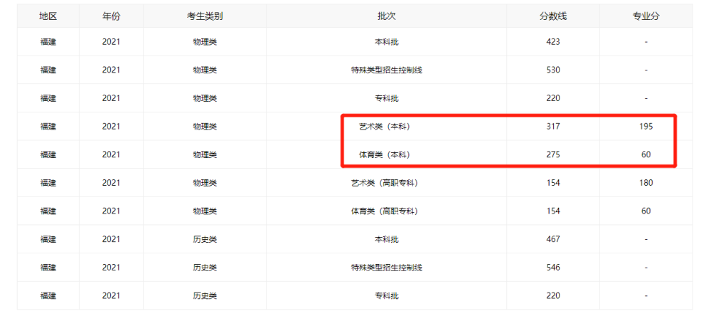 以2021年廈門高考分數線為例,理科最低分線為423分,藝術類分數線為317分,整整差了106分,也就是說,之前藝考生考318分就能跟424分上同等的本科院校。