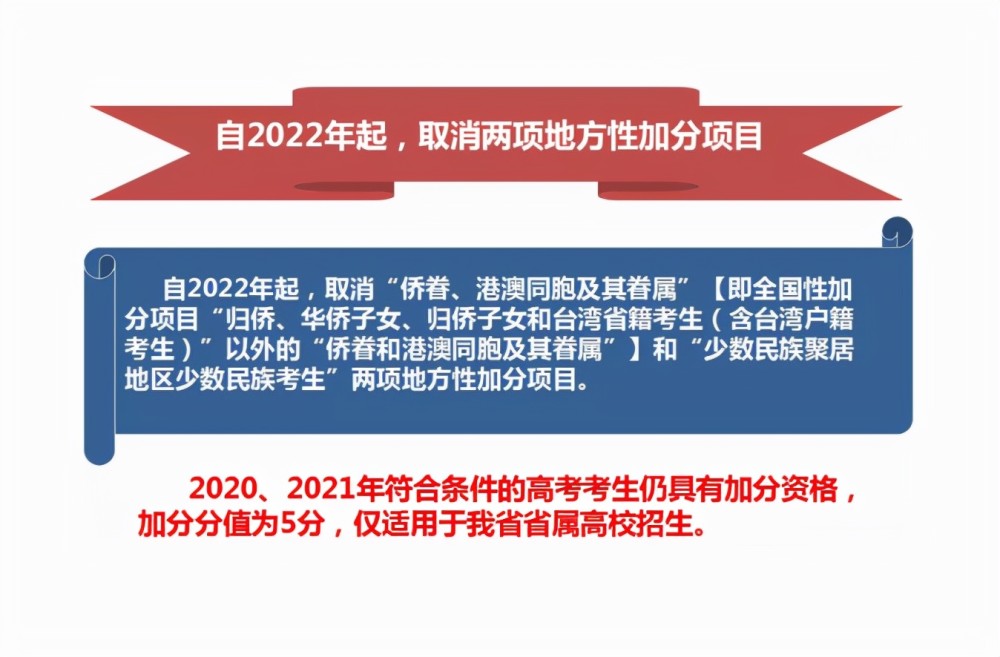根據教育部傳來的關于高考改革的新消息當中,可以看到,從2022年開始,地方性加分項目被取消,其中就包括歸僑子女、歸僑、華僑子女、臺灣籍考生;