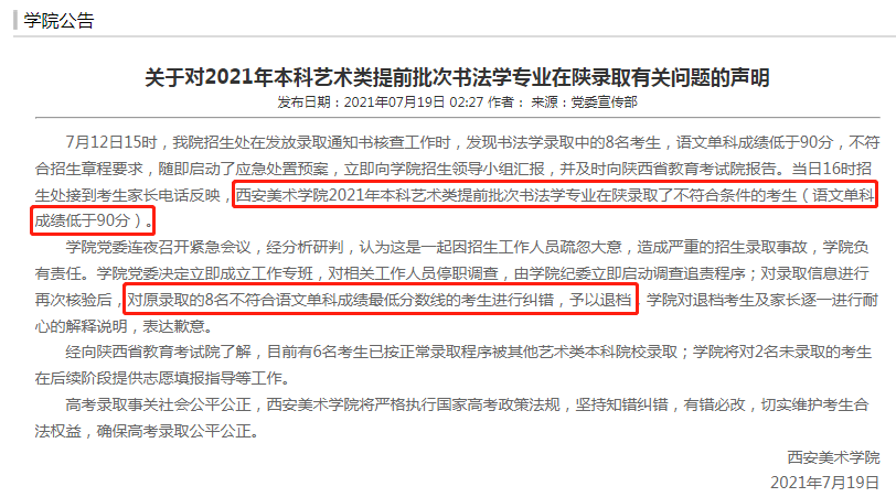 第二個(gè)原因就是考生的單科成績(jī)。比如2021年重慶工商大學(xué)的英語專業(yè)的單科成績(jī)要求110分及以上。如果考生的高考總成績(jī)達(dá)到重慶工商大學(xué)英語專業(yè)的最低提檔線,但英語成績(jī)不到110分,即使考試院投檔到重慶工商大學(xué),但大學(xué)招辦在審核專業(yè)要求時(shí)發(fā)現(xiàn)考生單科成績(jī)不達(dá)標(biāo),就會(huì)退檔。比如今年網(wǎng)上傳得沸沸揚(yáng)揚(yáng)西安美術(shù)學(xué)院8名書法學(xué)專業(yè)的考生因語文成績(jī)不足90分被退檔。雖然退檔的部分原因系招辦人員失職,但考生沒有了解該專業(yè)的單科成績(jī)要求而填報(bào)這個(gè)專業(yè)則是造成退檔的主要原因。