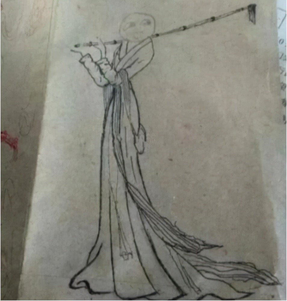 這位美術生在隨堂小考時想要畫一個扛著鋤頭、悠閑自得、身段優美的農家女子。很明顯,這位學生最開始描的是,這位女子的身段與衣服。最用心畫的衣服與身體顯得格外地優美動人。