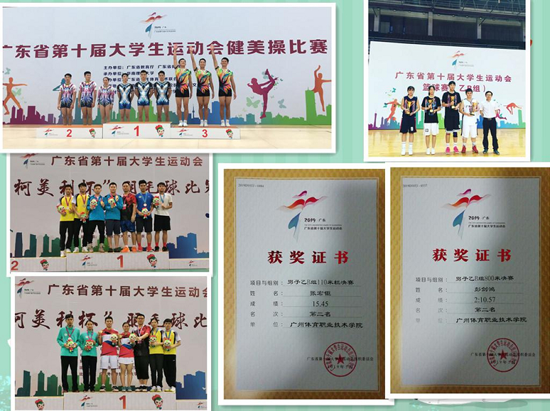 在本屆賽事中,廣州體育職業技術學院羽毛球隊披荊斬棘,勇奪單項賽乙A組男雙冠軍、混雙冠軍,團體賽乙A組男子團體亞軍。田徑隊斗志昂揚,斬獲2項亞軍,所有的16名選手均獲得獎項。首次組隊參賽的健美操啦啦操隊無畏強敵,成功收獲乙組(高水平專業組)團體第四名的傲人成績。籃球隊也不為人后,取得乙B組男子第七名,女子第七名。