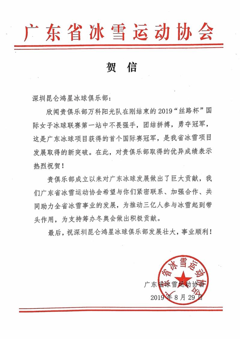 廣東省冰雪運動協會向深圳昆侖鴻星冰球俱樂部發出賀信。正文如下: