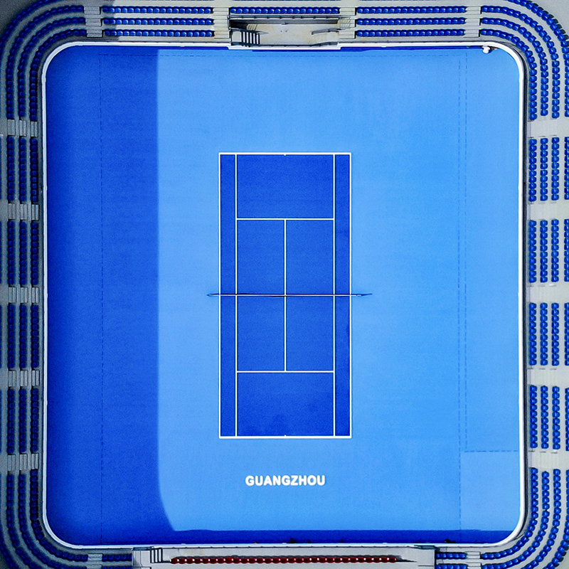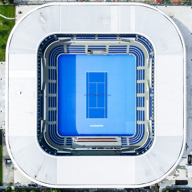 廣州網球中心場位于廣州天河體育中心東北側,設計秉持“實用、簡潔、美觀、大氣”的理念,方中帶圓的流線設計盡顯國際風范,蔚藍色的露天網球場被白色外圍建筑環繞,空中俯視就像一顆璀璨的藍寶石,場館周邊綠植采用疏林草地的簡約設計,為天河體育中心增添了新的亮色。場館一層采用玻璃幕墻設計,四周豎向分布的鋼骨架與大面積晶瑩剔透的玻璃幕墻相映襯,不僅使場館外形顯得輕盈、富有動感,更打造了較好的隔音、隔熱、穩定、安全的空間。