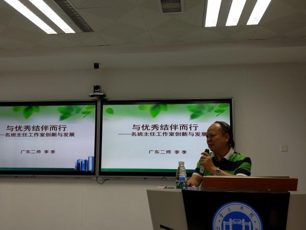 開班典禮結束后,廣東未來教育研究院李季教授為大家作“與優秀結伴而行——名班主任工作室創新與發展”專題講座。李季教授指出,班主任工作是有迷惑與困惑的,德育是由概念到觀念再到信念的過程,這是個內生外化的過程,其效果具有滯后性,需要與時俱進,探索德育過程需要盡心盡力,愿大家擁有太陽,如此才能播灑陽光。他指出,班主任專業發展生長點應有四個關注點,“專業能力是幸福,班主任智慧資源”、“心里同齡人是快樂班主任專業素養”、“研究意識是智慧型班主任成長之路”、“專業技能是智慧型班主任看家本領”。李教授跟大家分享班主任工作室的創建方法,他指出,能力大賽是班主任工作室創新第一生長點,作為工作室成員,既是參賽者,又是管理者,還是研究者,三角色融合有利于個人與團隊發展;家校共育是班主任工作室創新的第二點,I+We=Fully,I,即為你要在群體中才能發揮最大的優勢。成長導向是為喚醒學生的希望,讓學生自己對自己充滿信心。在分析成長導向問題時,李教授提到木桶原理與教練技術。并舉“提供一個鏡子,讓自己發現并改正問題”例子,引導參加培訓的老師在面對“差生”時如何做心理分析,以何種姿態對待優中差生。德育是個漫長的過程,老師身為班級領頭羊應該學會當一個有意思的班主任,真正喜歡與投入德育工作。