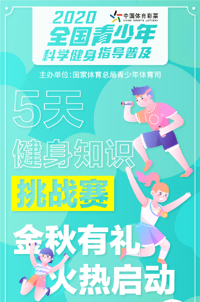 來了!由國家體育總局青少年體育司主辦,國家體育總局體育科學研究院承辦,廣東原動力信息科技有限責任公司執行的“2020年全國青少年科學健身指導普及——5天健身知識挑戰賽”國慶正式啟動!陪你度過一個有意義的黃金假期!