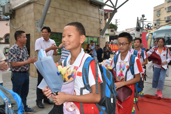 7月29日,華文學校跳繩隊教練和運動員們載譽而歸,橫欄鎮教育事務指導中心霍嘉俊主任、華文學校董事梁耀新、祝和群先生、華文學校謝春生校長以及運動員家長等人到學校門口迎接他們的歸來,并在學校會議室舉行了座談會。