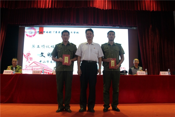 最后是表彰優秀學生。程校長、馬書記和張教導員為上學期被評為優秀團干部、優秀班干部和“三好學生”榮譽的學生頒發獎狀。