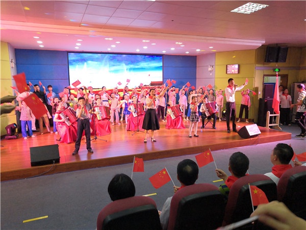 本次隊日活動緊扣主題,發(fā)掘南區(qū)的紅色文化和僑鄉(xiāng)文化,結(jié)合對偉大祖國70周年華誕的美好祝福,通過六個篇章的演繹,展現(xiàn)了新時代少先隊員富有朝氣、充滿活力、積極向上的精神風貌,是對少先隊員進行社會主義核心價值觀教育的一次良好實踐。其中,紅領(lǐng)巾快閃融合手風琴演奏、獨唱、合唱、健美操等多種形式,調(diào)動了現(xiàn)場觀眾的熱情,大家齊唱《我和我的祖國》,將活動推向高潮。