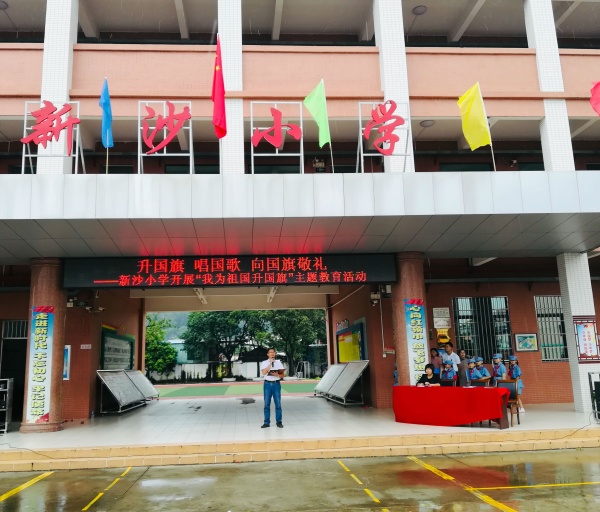 9月2日上午7點多,新沙小學校園處處洋溢著喜慶的氣氛,師生們精神抖擻進入校園,葉景乾校長就在校門口熱情地迎接同學們并派發小彩旗,為“升國旗,唱國歌,向國旗敬禮”活動做好充分的準備。