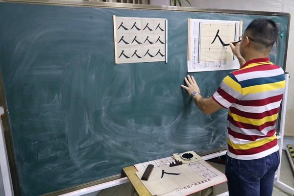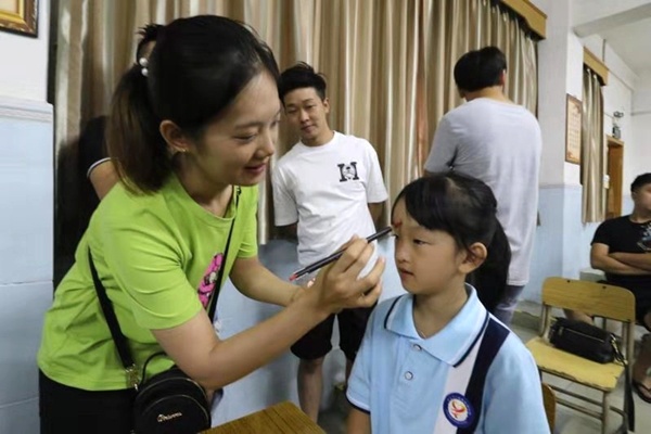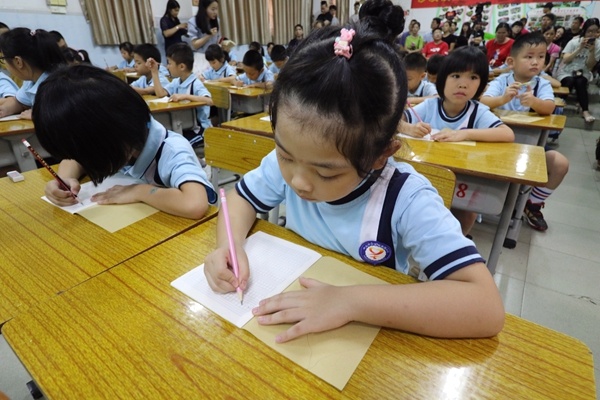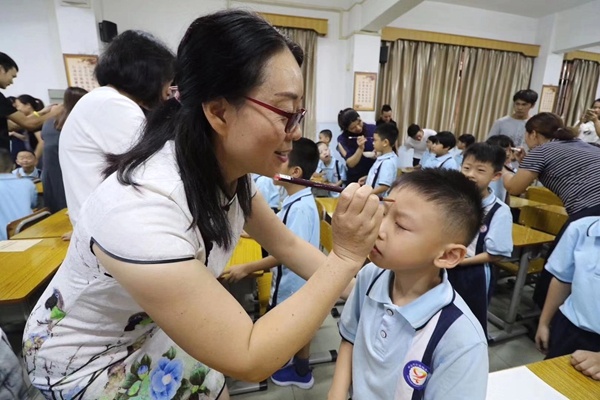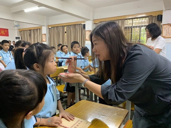 圣獅小學黃校長致辭后,開筆禮正式開始。孩子們在主持人話語的引導下,孩子們正衣冠、朱砂啟智、擊鼓鳴志、描紅“人”字、齊誦弟子規和孝親敬師。在自正衣冠環節中,孩子們知道了著裝要整潔。通過朱砂啟智環節,孩子們得到了領導、老師和家長的祝福,通過點“痣”,開啟智慧,從此眼明心亮,好讀書,讀好書,讀書好。擊鼓鳴志環節中,黃校長擊的三聲鼓聲,聲音響且傳得遠,寓意著孩子們志向遠大。第四環節是啟蒙描紅,黃解球老師分別用粉筆和毛筆示范書寫“人”字。孩子在開筆禮現場寫“人”字,寓意著在人生的啟蒙階段,要學會做人。隨后,一年級新生在丁老師的帶領下,齊誦弟子規的節選部分。最后,為傳承“孝、禮”好家風,發揮圣獅小學校園文化核心“傳承好家風”的傳統,孩子們在主持人的引導下,向老師和父母行鞠躬禮,表示感恩。