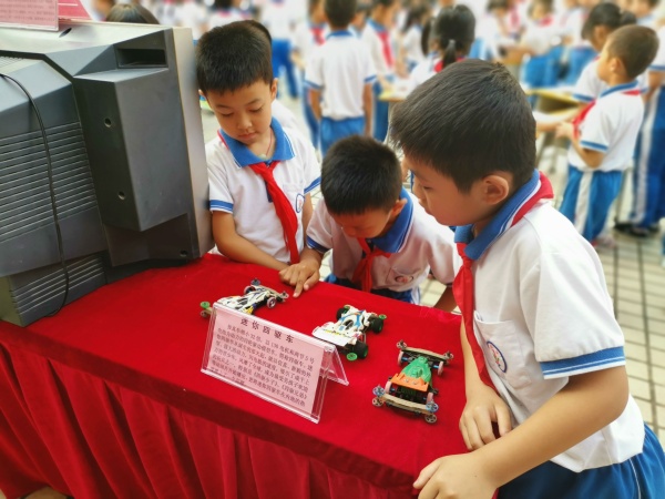 學(xué)生自由地在展覽場(chǎng)地參觀每一份傳家寶,用眼看,更用心感受一份份印刻著歷史溫度的記憶。活動(dòng)展板所展示的內(nèi)容均是與人們的與生活息息相關(guān)的方方面面,如“書(shū)包的發(fā)展史”、“交通工具的發(fā)展史”、“電視機(jī)發(fā)展史”、“中國(guó)農(nóng)具大發(fā)展史”、“照明工具的發(fā)展史”、“中國(guó)錢(qián)幣的發(fā)展史”、“中國(guó)服飾的發(fā)展史”、“家用‘四大件’變遷史”、“通訊工具的發(fā)展史”、“計(jì)算工具的發(fā)展史”、“玩具發(fā)展史”和“中國(guó)書(shū)籍發(fā)展史”,而展出的由師生共同提供的實(shí)物,無(wú)疑更加吸引學(xué)生和家長(zhǎng)的目光。
