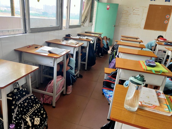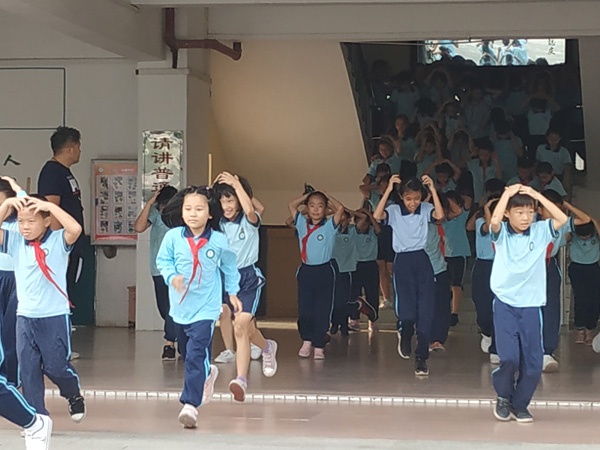 下午4時演練活動正式開始,演練主持通過廣播向全體師生講述本次演練的實際意義、注意事項及相關(guān)要求。隨后,通過廣播緊急通知學(xué)校發(fā)生地震,請全體師生緊急躲避。各師生立即抱頭躲避,直至廣播提示地震已經(jīng)停止才開始從課室往疏散點進(jìn)行撤離。此外,疏散引導(dǎo)組的老師在相應(yīng)樓梯口位置緊引導(dǎo)學(xué)生做好避險和疏散。全校師生順利集中到操場的疏散點后,各班以班級為單位集隊并立即清點人數(shù),將人數(shù)向黃健翼和陳海輝老師報告。最后,黃老師向陳子兵副校長匯報:本次演練應(yīng)到人數(shù)全部順利地疏散到安全地點。